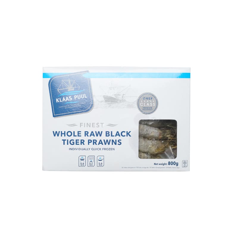 - Langostino Black Tiger, entero, con cáscara y cabeza. En caja de 800 g.